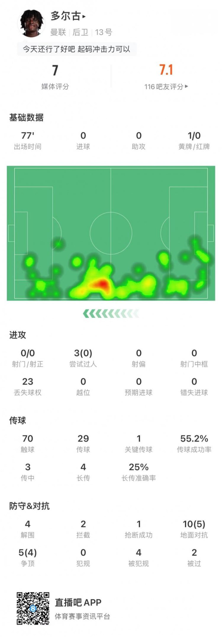直播吧11月8日讯在英超联赛第11轮中,曼联客场挑战热刺。此役多尔古担任曼联的首发左翼卫,直到第77分钟时被换下。他在防守端表现可圈可点,不过处理球方面仍暴露一些问题。